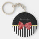 Ein eleganter, einfacher Schlüsselanhänger mit senkrechten schwarz-weißen Streifen, verziert mit einem schicken IMITAT goldfarbenen Streifen und einem Bild eines klassischen roten Bändchenbogens. Personalisieren Sie es, indem Sie den Namen des speziellen Mädchens in Ihrem Leben hinzufügen. Flachdruckbild, NICHT metallisch oder tatsächlicher Bogen.