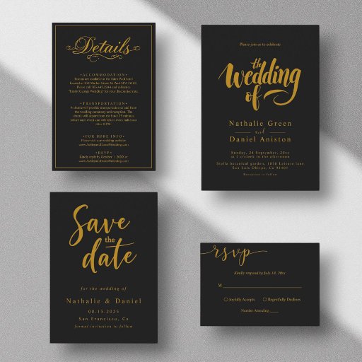 Diese elegante Schwarz-Gold-Hochzeitseinladung eignet sich perfekt für eine moderne Hochzeit. Das einfache Design zeichnet sich durch elegante goldene Kalligraphie auf schwarzem Hintergrund aus. Die Einladungskarte enthält die Hochzeitsdetails auf der Rückseite, anstatt für eine separate Kapselkarte zu bezahlen.
