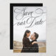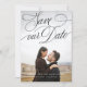 Dieser klassische und traditionelle Stil Save the Date mit einer Platzhalterkarte für ein Foto ist ideal für Paare, die eine traditionelle Ästhetik Liebe. An der Vorderseite steht das Wort "rett unser Datum", das in einer romantischen, klassischen, schwindenden Kalligrafie-Schrift geschrieben ist. Die Hintergrundfarbe auf der Rückseite der Karte kann in jede gewünschte Farbe geändert werden.