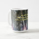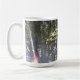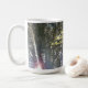 Inspirative Tasse mit einem gedruckten Foto-Bild von schönem Sonnenlicht, das zwischen Kiefernbäumen scheint.