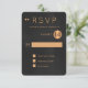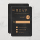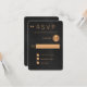 Elegante luxuriöse Hochzeitskarte mit zwei kleinen goldenen Kupferherzen aus Kupfer und einem Kreis mit dem gewünschten Antwortdatum auf einer schwarzen antiken, bedrückten Samt wie Hintergrund. +++++++++++++++++ Die Karte eignet sich für moderne Hochzeiten in allen Jahreszeiten. Meistens empfohlen für elegante Empfänge.