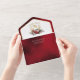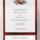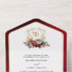 Das zeitlose und elegante und festliche Hochzeitsdesign mit klassisch handgezeichnet goldblühendem Wappen und einem farbenfrohen Spray aus rot-weißen Weihnachtsgebäck und Evergreens. Diese benutzerdefinierte Vorlage enthält bearbeitbare Textfelder, benutzerdefinierte Textgrafiken und eine goldstrukturierte Grenze. Der Außenrand und der Rücken sind mit einem opulenten, rubinroten Samthintergrund versehen.
