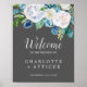 Dieses klassisch weiße Blume-Begrüßungspakel ist perfekt für eine Hochzeit im Herbst. Das elegante Blumendesign besticht durch weiche Elfenbein- und Weißrosen und Pfannkuchen mit Touchs von periwinkelblauen Aquarellfarben und grünem Blattwerk auf grauem Hintergrund. Passen Sie das Poster mit dem Namen der Braut und Bräutigam und dem Datum der Hochzeit an.