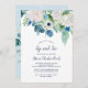 Diese klassisch weiße Blume schlendern und sehen Einladung ist perfekt für einen Frühling treffen Sie das Baby Party. Das elegante Blumendesign besticht durch weiche Elfenbein- und Weißrosen, Pfannkuchen und Chrysanthemum mit Touchs von periwinkelblauen Aquarellfarben und grünem Blattwerk.