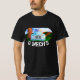 Dieser T - Shirt zeigt ein Bild mit einem klassischen, blauen, alten LKW, der an einem Baum auf einem Feld sitzt, auf dem die Sonne scheint.