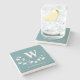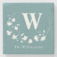 Dieser stilvolle Untersetzer aus Stein zeichnet sich durch Ihren Namen und das Monogramm aus, zusammen mit einem hübschen Blumenkranz in aquamarinem Grün und Weiß.
