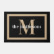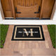 Einfache und elegante Türmatte mit Familienname und Monogramm in klassischer Schrift auf schwarzem Hintergrund, gerahmt durch einen dicken Bräunungsrahmen.