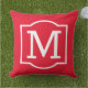Stilvolles und klassisches quadratisches Kissen mit Akzenten im Außenbereich mit einem Monogramm-Initial mit einem schlichten, weißen Rahmen mit roter Hintergrundfarbe. Passen Sie den Hintergrund an, um sich mit Ihrer Außendekoration abzustimmen.