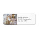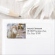 Adressetiketten mit einem schönen, klassischen Foto. Ein Erntedank-Urlaubstisch mit feiner China und Glaswaren. Extravagante goldfarbene Buckelleuchten im Hintergrund. Auf einem Teller steht ein Single weißer Kürbis.