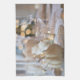 Ein Küchentuch mit einem schönen gediegenen Foto. Ein Erntedank-Urlaubstisch mit feiner China und Glaswaren. Extravagante goldfarbene Buckelleuchten im Hintergrund. Auf einem Teller steht ein Single weißer Kürbis.
