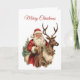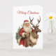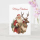 Weihnachtskarte mit einer lustigen Weihnachtsillustrierung. Der Weihnachtsmann in seinem traditionellen roten Anzug reitet auf einem großen, mit Heiligen dekorierten Rentier. Ein Weihnachtsbaum hinten.