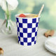 Auf diesen Papierbechern erscheint ein klassisches dunkelblau-weißes Schachbrettmuster.