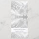 Das klassisch katholische Mit Monogramm Wedding Menu bietet Ihren Text in einem eleganten, silbernen Schriftart in einem silbernen Rahmen. Auf beiden Seiten der Position werden oben zwei kleine Kreuze angezeigt. Reverse bietet einen eleganten Imitat-Satin-Hintergrund zum ersten Nachnamen eines Paares, der in einer großen, weißen Schrift dargestellt wird. Unten werden die Namen und das Datum der Hochzeit des Paares auf weißer Seite dargestellt.