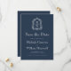 Diese Vintag-inspirierte Hochzeit Save the Date Design verfügt über ein Paar weißer Monogramm-Initialen in einem offenen Serif-Schriftart über und unter einer Trennlinie und umrahmt durch eine Linie botanisches Wappen auf marinebasischem Hintergrund. Die Rückseite der Karte ist blau und massiv.