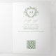 Elegante klassische traditionelle französische viktorianische Salbeigrün-Toile de Jouy-Chinoiserie-Crest-Monogramm charmante ein-in-einem-Hochzeitstrifalt-Einladung mit Gästeinformationen und QR-Code (automatisch generiert mit Ihrer Webadresse) zur Online-RSVP.