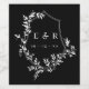 Elegante Hochzeitsweinetiketten mit weißem Schild-Wappen auf schwarzem Hintergrund, mit schwarzen Blätter geschmückt, in der Mitte das Mongramm und das Hochzeitdatum in Weiß.