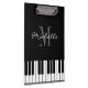 Flügel befestigt Monogramklemmbrett für Pianisten oder Musiklehrer. Personalisierter Klippbrettentwurf mit Schwarzweiss-Tastatur und eleganter Skripttypographie. Geschäftsversorgungen und -zusätze für Lehrer, Musiker, Klavierspieler, pianoman, Freunde, Familie, Kinder, Mamma, Vati, Trainer, Künstler, den Produzenten etc. handlich für Anmerkungen, Musikblätter etc. die musikalischen Geburtstagsgeschenkideen für ihn und sie. Doppeltes versah Entwurf mit individuellem Namen oder Zitat mit Seiten. Mit Monogramm Geschenke für Arbeit, Job, Praxis etc.