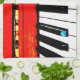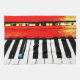Teetuch mit posterized Ansicht des Klaviers mit Schwarzweiss-Klavierschlüsseln und gelbem und rotem Klavierrahmen.