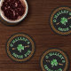 Rund personalisierte irische Pub-Untersetzer mit grünen und orangefarbenen Schriftart, eine orangefarbene, keltische Knotenlinie, die den Text umrahmt, Ihr Name in kurviger Schrift über einem Kleeblatt mit dem festgelegten Jahr und dem Namen Ihres Pub darunter.