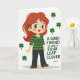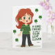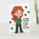 Diese Karte zeigt ein Mädchen mit ingwerfarbenem Haar, smaragdgrünen Augen und einem offenen Lächeln, das links steht, als ob es sich gerade einem nahen Freund zugewandt hat. Ihr rötlich-braunes Haar fällt in weichen Kurven, und ein einzelnes vierblättriges Kleeblatt ist hinter ihrem Ohr wie ein süßes, kleines Nicken zu jemandem Besonderem versteckt ☘️. Sie trägt ein horizontal gestreiftes Hemd in schattiertem Grün vor einem hellen weißen Hintergrund, der mit kleinen, tiefen Waldgrün-Kleeblättern bestreut ist. Die Szene wirkt freundlich und ein bisschen romantisch auf sanfte Weise, wie das Lächeln, das man teilt, wenn man ein und dasselbe glückliche Geheimnis teilt 💚. Auf der rechten Seite ist grüne Schrift in klaren Linien gestapelt und liest: „Ein guter Freund ist wie ein vierblättriges Kleeblatt.“ Der Text sitzt be