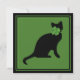 Schwarze Silhouette einer Katze mit einem Kleeblatt-Bogen auf grünem Hintergrund.