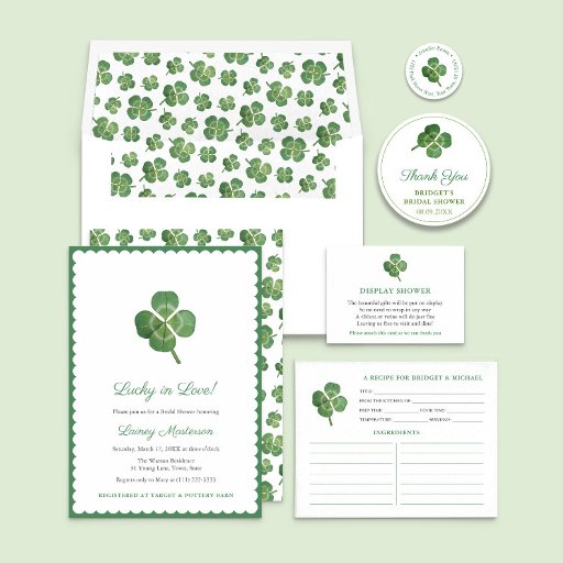 Stilvolle Gefälligkeitsboxen mit einem Aquarellfarben-vierblättriges Kleeblatt-Hintergrund hinter der Frontblende, zusammen mit dem personalisierten Text.
