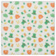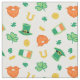 Stoff für den St. Patrick's Day mit einem Muster aus orangefarbenen Bärten, Koboldhüten, Goldmünzen, Kleeblättern, irischen Flaggen und Hufeisen.