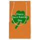 Grosses grünes Kleeblatt auf der Vorderseite und auf der Rückseite der großen Geschenktüte mit der Formulierung in weißem Text, Happy Saint Patrick's Day, Luck of the Irish to You. Behalte den Text so, wie er ist, oder personalisiert die Textfelder. Feierliche, zweiseitige St. Patrick's Day Geschenktaschen. Originelle Kunstwerke und Design von TamiraZDesign.