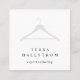 Elegante Visitenkarten für Seemänner, Modedesigner, Schneider, Umbauten oder Trockenreiniger in einem einzigartigen quadratischen Format verfügen über einen Kleiderbügel in schick hellgrau mit zwei Zeilen benutzerdefiniertem Text in knusprigem Schwarz. Passen Sie die Rückseite mit Ihren Kontaktdaten in weißer Schrift auf schwarzem Hintergrund an.