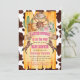 Kleines Cowgirl ist auf dem Weg Rodeo Pferde Western Farm Baby Dusche Einladung mit einem Rad, Cowboystiefel, Cowboyhut, braunes Kuhhautmuster, Western Wild West Stil.
