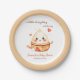 Ein kleines Dumpling ist auf dem Weg, Bao in the Oven, Dim sum, Kawaii, geschlechtsneutrale Baby Duschpapier Teller, mit Aquarellmalerei eines niedlich spielerischen Knödels in weichen Pastellbraun, Beige und Rot Farbpalette, Drehung zum klassischen "Bun in the Ofen" Konzept.