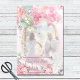 Wunderschöne Engel, die durch eine offene Tür schauen, umgeben von rosa Rosen und einer schneeweißen Feder. "Engel sind bei uns" in einem silbernen Glitzer-Schrift. Diese wunderschöne, böhmische Kunst ist verträumt und elegant.
