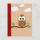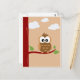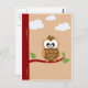 Eine Postkarte einer niedlichen Eule, die auf einem Baum mit Wolken im Hintergrund sitzt. Das Design ist farbenfroh und schlicht ansprechend.