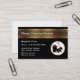 Klassische Hausreiniger Visitenkarte Design Vorlage mit einem goldfarbenen Putzemblem mit Mülleimer, Fußbodenreinigungsmaschine und Putzhandschuhen, zusammen mit einem einfachen Layout, das speziell für den Online-Einsatz entwickelt wurde. Ein Blick in die Höhe auf ein Budget, das auf hochwertigen Papierunterlagen gedruckt wurde, das größer als der Standard ist, sagt auch: Visitenkarten in Euro-Größe.