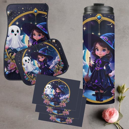 Kleine Hexe mit großen, funkelnden Augen. Neben ihr schwimmt ein niedlicher Geist, der freundlich aussieht und eine spielerische Aura hat. Das Design vermittelt ein Gefühl der Freundschaft und Magie