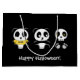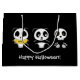 Zwei kleine Pandas sitzen im Dunkeln mit einem kleinen Skelett. Ein Panda trägt ein gelbes T-Shirt mit dem Wort "meh" darauf.