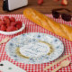 Kleine pastellblaue Blüten Goldbarsch Wasserfarbe Pappteller