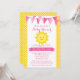 Eine niedliche Sonnenschein-Thema Mädchen-Dusche Einladung. Das Design zeichnet sich durch fröhliche Farbtöne von Gelb und Rosa aus.