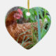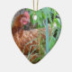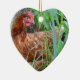 Dieses ist ein rhodey oder ein legendes Huhn Rhode Island Rotes X mit rotem Kamm und Schnabel und hübsche orange Federn. Sie pausierte und warf für ein Porträt beim Verkratzen für Würmer unter einem großen Baum im hohen Gras auf.