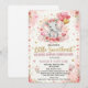 Veranstalten Sie eine Traum-Baby-Party mit dieser charmanten "Little Sweetheart"-Einladung, die speziell für die Feier zur Geburt eines Valentinstags-Mädchens entworfen wurde. Diese Karte zeigt einen niedlichen, im Aquarellstil gemalten Baby-Elefanten, der herzförmige Luftballons hält und zwischen weichen rosa Pfingstrosen und goldenen Sternen eingebettet ist.