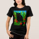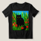 T-Shirt in einer kleinen schwarzen Katze mit gelben Augen, in einem Garten, umgeben von roten Tulpen und grünem Blattwerk