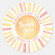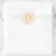Dieses runde Aufkleber-Design strahlt in der Mitte eine lebendige Sonne aus. Der fröhliche Satz "Danke!" steht oben in einem warmen orangefarbenen Schriftart. Die Sonnenstrahlen strahlen in klassischen Gelb-, Orange- und Rottönen aus, was der Babydusche eine fröhliche und helle Touch verleiht. Die "Babydusche der Mama" und das Baby-Duschdatum sind elegant um den Rand herum angeordnet und sorgen für ein nahtloses und personalisiertes Design. Dieser Aufkleber ist eine perfekte Ergänzung zu Favoriten, Danksagungen oder Dekorationen, die Ihre sonnenthematische Feier wunderbar verbinden. Vollständig anpassbar, können Sie den Namen und das Datum auf Ihre Veranstaltungsdetails anpassen. Eine süße und nachdenkliche Art, Ihren Gästen zu danken!