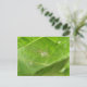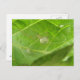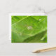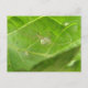 Diese Postkarte zeigt ein detailliertes Foto einer kleinen Gartenspinne, die auf einem Brokkoli-Blatt sitzt. Das winzige Wesen ist fast transparent. Das Foto ist so detailliert, dass man sogar ein paar Stränge des Spinnennetzes sehen kann.