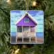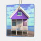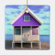 Dekoration in einer niedlichen kleinen Strandhütte / Ferienhaus auf Pfählen, weiß und lila, auf dem Sand, mit blauem Himmel und weißen Wolken