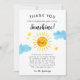 Niedliche Sonnenschein Thema Babydusche danke Ihnen Vorlage Karte mit Aquarellbild einer lächelnden Sonne mit Sternen und Wolken. Im Text steht: "Danke, dass du unsere kleine Sonne geduscht hast!" Die Standard-Nachricht danke den Gästen für die Anwesenheit der Dusche und für das Geschenk. Geschlechterneutrales Design.