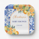 Elegante Aquarellfarben Zitrusgebäck Babydusche Teller. Das Design zeichnet sich durch Aquarellbilder von Orangen, Clementinen, Zitronen und grünen Blätter aus, die einen zauberhaften Kachelhintergrund für ein mediterranes Ambiente im Sommer bilden. Verwenden Sie die Entwurfstools, um Text, Schriftart und Farbe anzupassen.