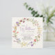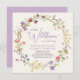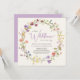 Eine elegante, hellcremefarbene Duschbox mit "Eine kleine Wildblume ist unterwegs", die in einer Mischung aus moderner, weicher grauer Typografie und einem stilvollen Lavendelskript sowie einem boho-inspiriert Kranz aus lila, rosa, pfirsichfarbenen und gelben Wildblumen-Aquarellen geschrieben ist. Personalisieren Sie den Namen der Mutter und Duschdetails in einfachen Lavendel und graue Typografie.