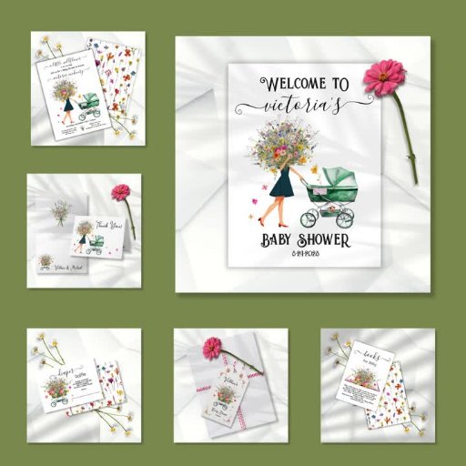 "Eine kleine Wildblume" Baby Dusche Einladung. Ideal für einen Garten, draußen oder boho fühlen! Ein riesiger Strauß einer junge Mutter mit ihrem Baby in einem Kinderwagen. Geschlechtsneutral mit Blume in gedämpften, hellen Pastellfarben. Alle Formulierungen können geändert werden! Ideal für einen Garten, einen Bauer-Markt, eine Wildblume oder ein Picknick-Baby-Dusche. Weitere Änderungen finden Sie unter Anpassen dieser Vorlage. Am unteren Rand sehen Sie "Gewollt, um dieses Design noch weiter zu anpassen? Klicken Sie auf das EDIT-Tool mit Design.