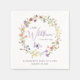 Elegante Babyduschnapkins mit "einer kleinen Wildblume ist auf dem Weg", geschrieben in einer Mischung aus moderner, weicher grauer Typografie und einem stilvollen Lavendel lila Schrift, und einem boho-inspiriert Aquarellkranz aus lila, rosa, pfirsichfarbenen und gelben Wildblumen und einem lila Schmetterling. Personalisieren Sie den Namen und das Duschdatum der Mutter in einfachen Lavendel und graue Typografie.