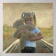 Kleines Mädchen mit Teddybär auf Eisenbahnschienen.